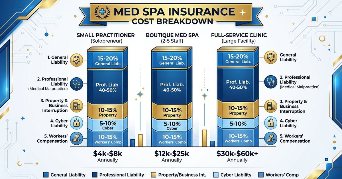 Estimates based on industry data from [Insureon](https://www.insureon.com/personal-care-business-insurance/medical-spas/cost) and [CarePro Insurance](https://www.careproinsurance.com/).